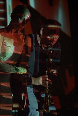 Second was the german-french quartet COURANTS with a dark multimedia peformance. Brilliant video-installations illustrating gloomy, layered soundpiles. The picture of a world between hectic activity and emotional icecold torpor is shown. Not even the flexible androgynous dancer Fine Kwiatkowski finds a way out. Enthusiastic applause, heavy stuff.