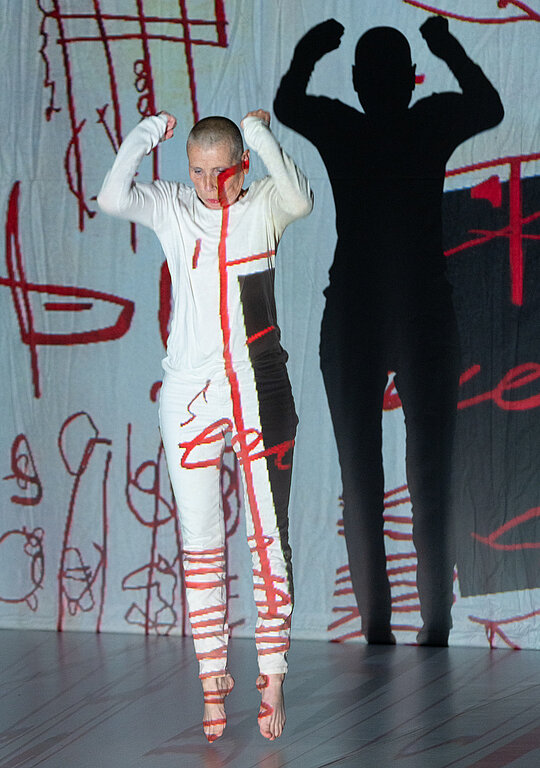 Die Tänzerin Fine Kwiatkowski setzt sich in Verbindung zur Malerei. Ihre abstrakten Körperbilder beeinflussen und verändern diese. Der Perkussionist Reinhart Wronna, vom Orchester des Staatstheaters, erweitert die Wahrnehmungsebenen durch seine im Moment erspielten Klänge.